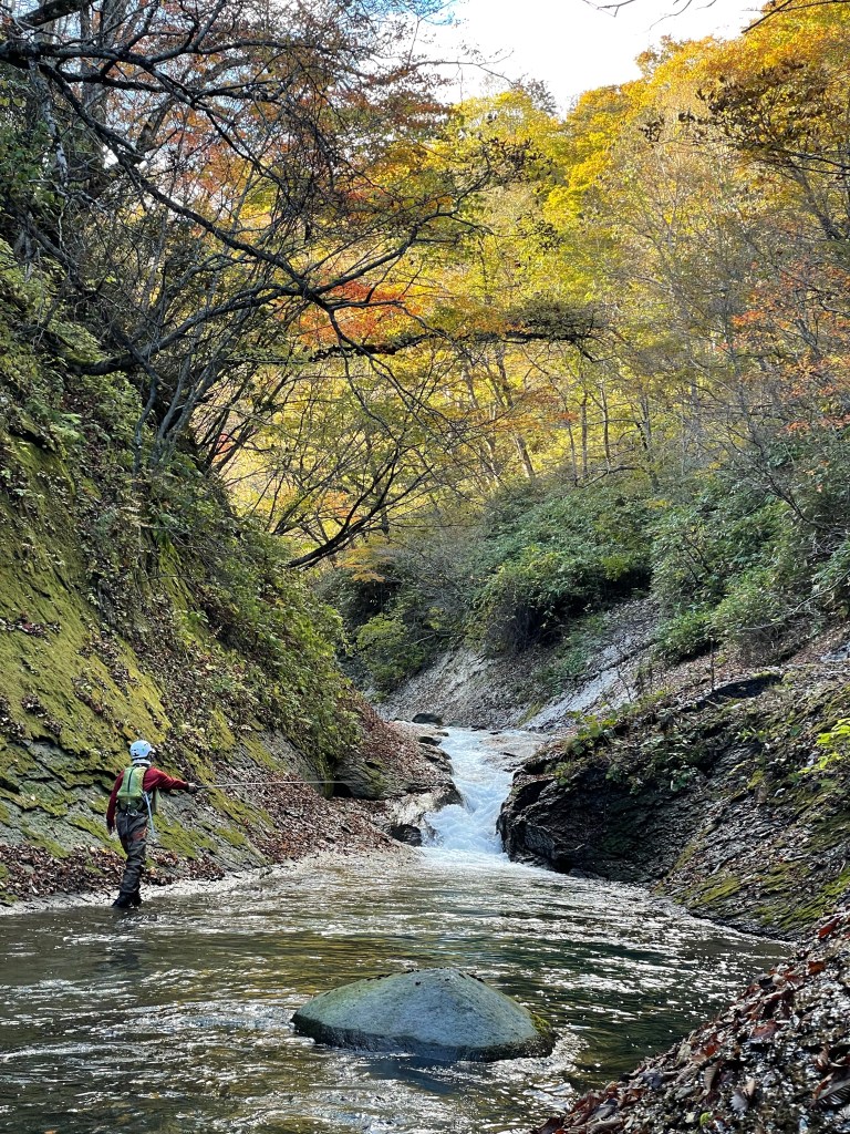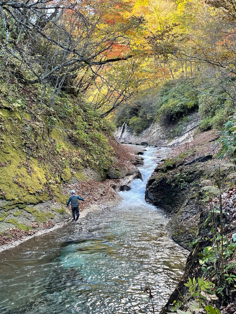 晴れ予報の地域を選びいざ入渓。ここももれなく紅葉のタイミング。初夏や夏にも訪れていましたが、秋も素晴らしい渓相🍁