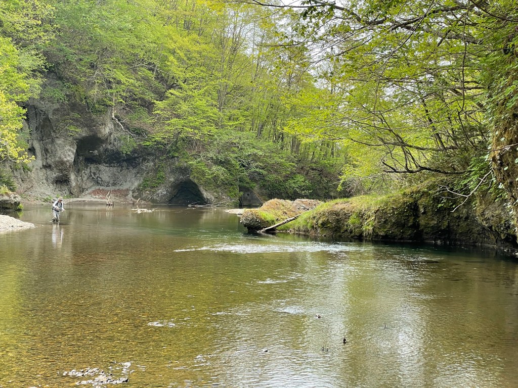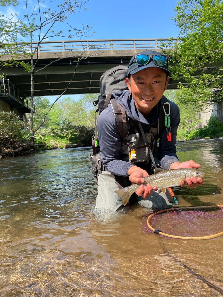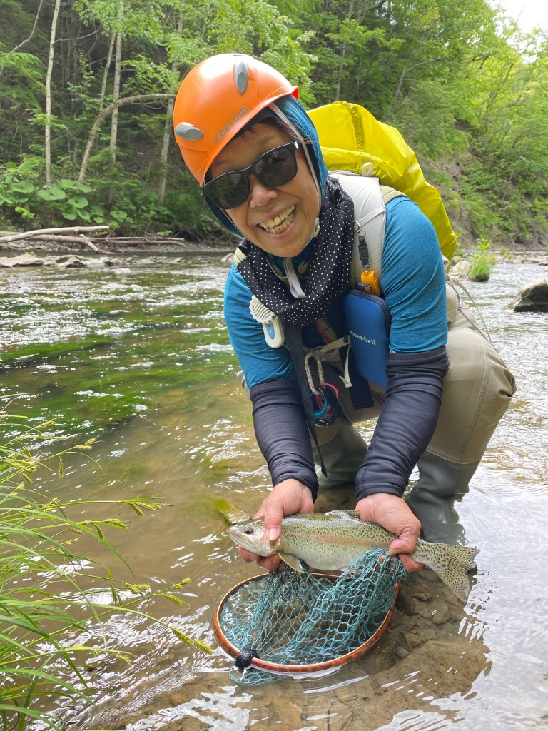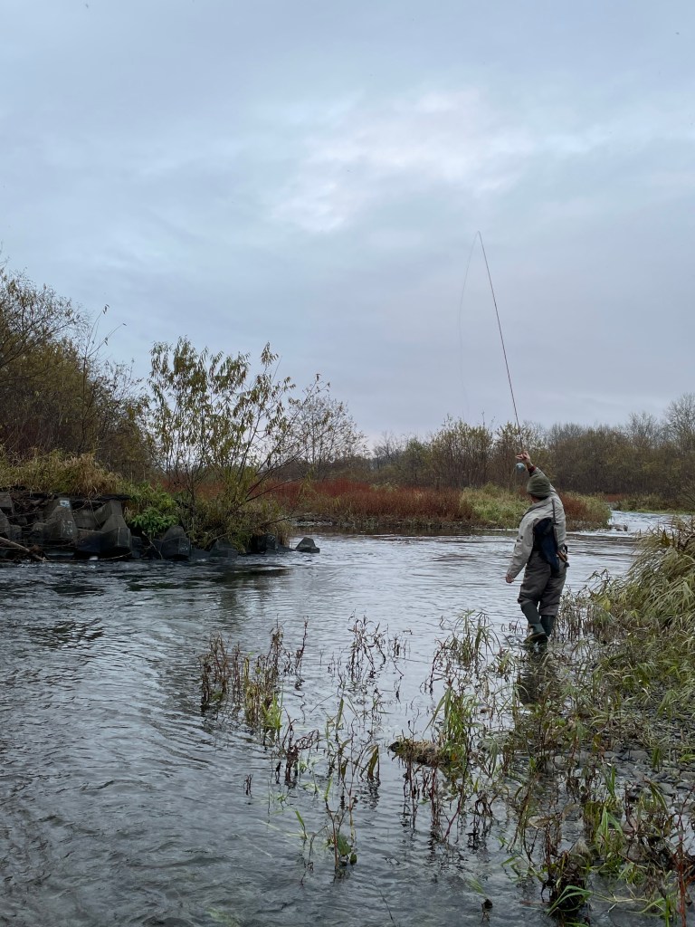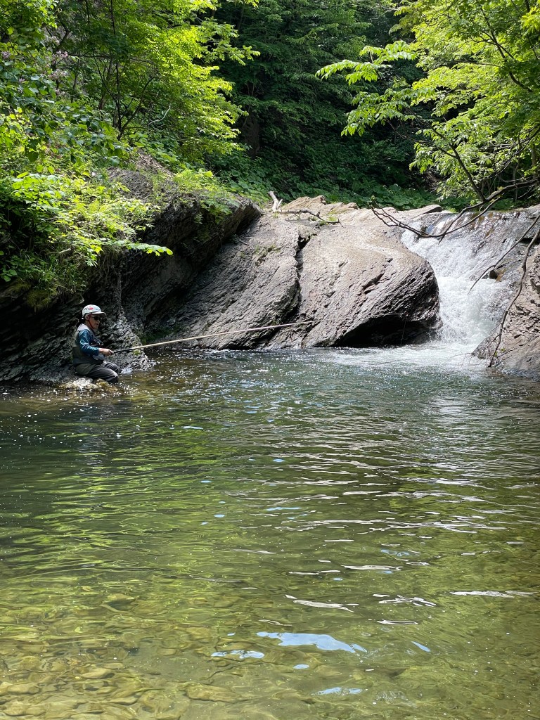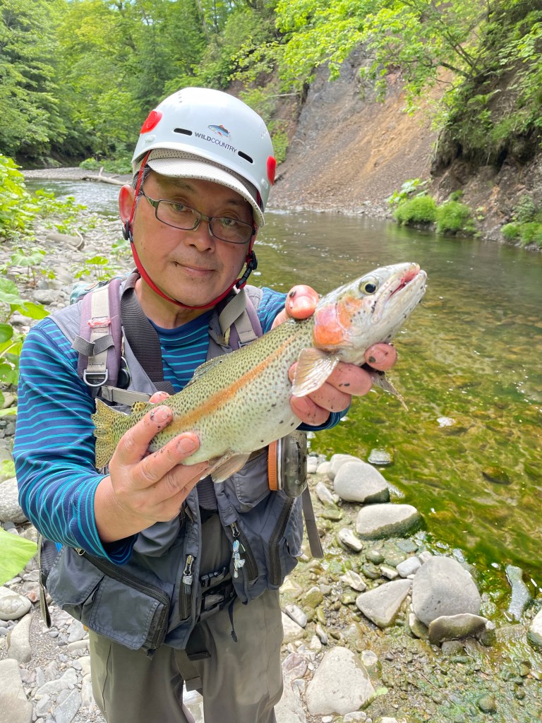 流石にこの時期、歩き始めは札内ダムゲートから。その後の沢歩きは渓流釣りツアーで用意しているウェーダーを皆さんに履いてもらって。