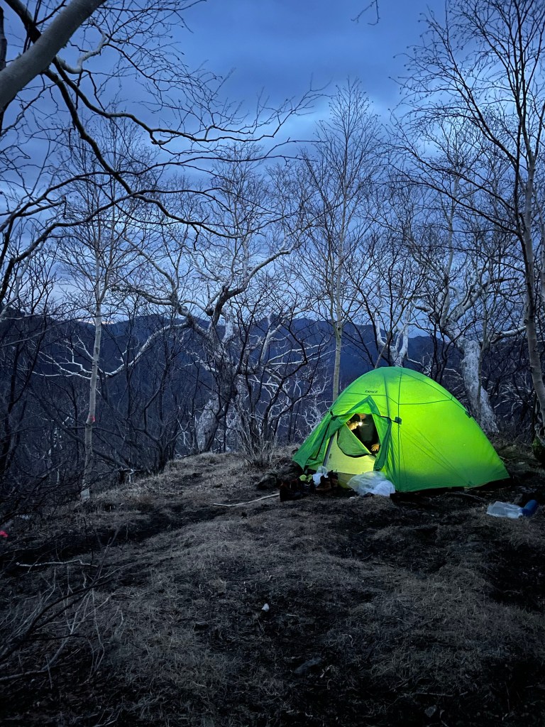 この日は1305mの夏尾根途中のテント場にて幕営。悪天に捕まって脱出不能にならないためにも、ここをベースキャンプとする事にしました。