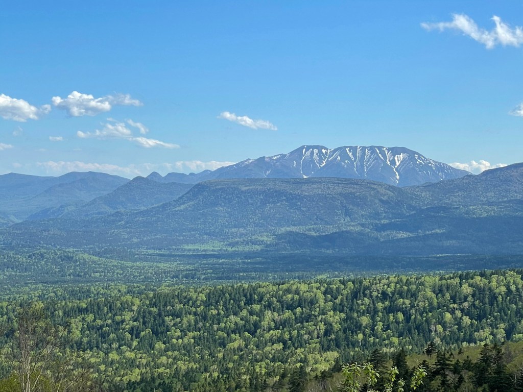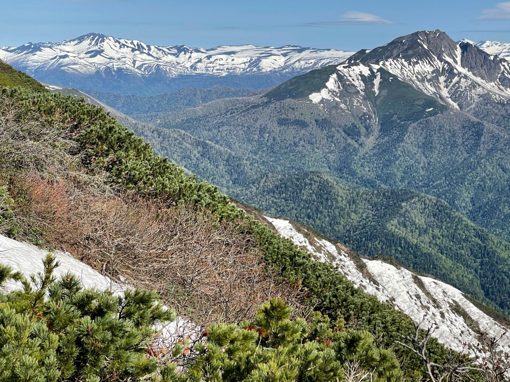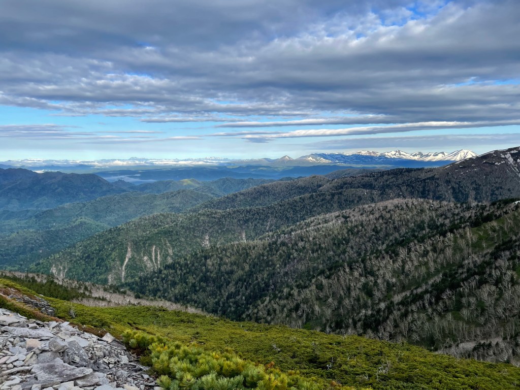 稜線から抜群の展望。南には日高山脈〜十勝連峰。東は雌阿寒岳、雄阿寒岳、斜里岳、そして知床連山〜知床岳まで眺められました。糠平富士に上がると北側、西側の景色も広がります。今回も素晴らしい景色を見せてもらいました。