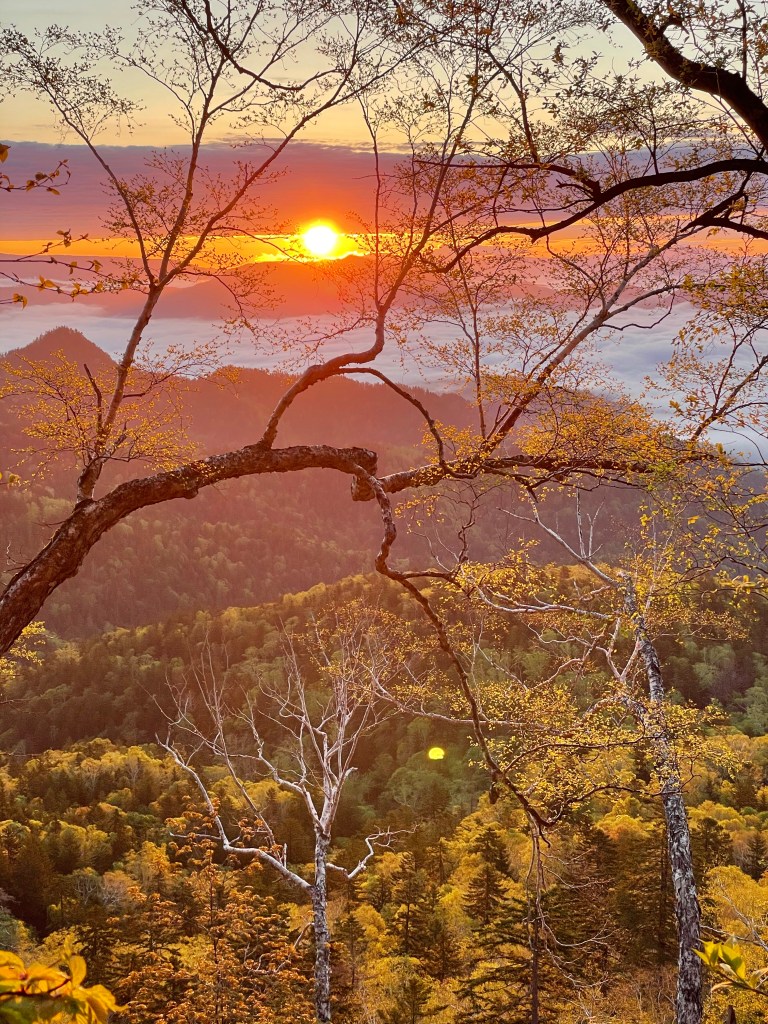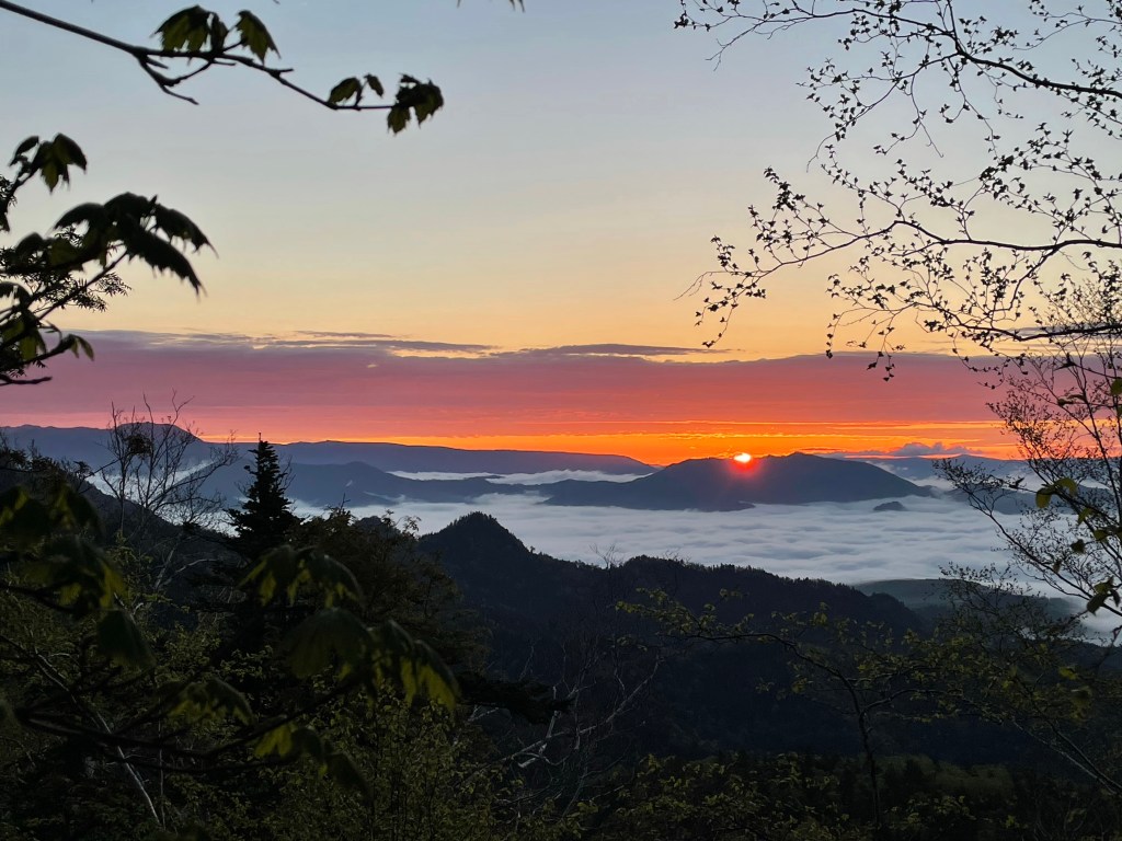 日の出前の出発は2:30。少しすると東空が徐々に明るくなり、色の変化を楽しみながらのスタート。高気圧を感じ取っているのか鳥たちも活発で、御来光を迎える前に森の中は大合唱。とっても賑やかでした。